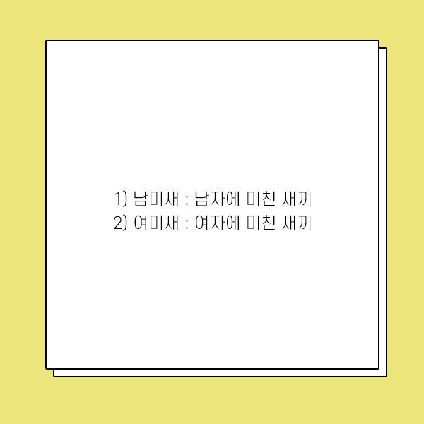 반대로 "여미새 뜻"은 "여자에 미친 새끼"를 줄인 것으로, 여성에게 지나치게 집착하는 남성을 가리킵니다.